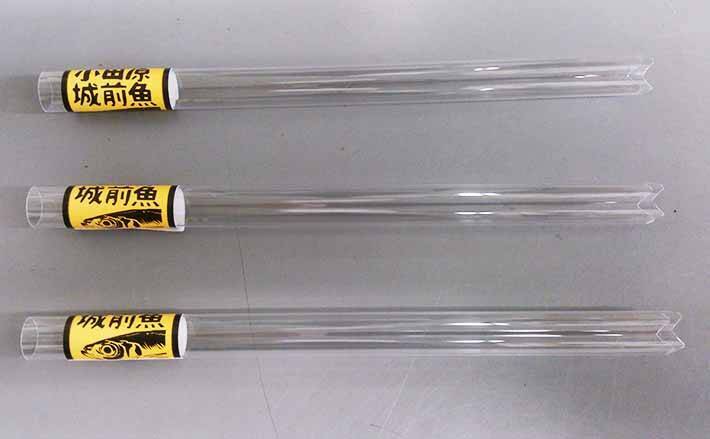 この「魚体中骨抜き具」はポリエチレン製で、長さ15cm、直径1cmほどの硬く丈夫で透明なストロー状になっています。先端は波打つようにカットされており、魚体に差し込むときに大きな力が必要にならないよう設計されています。
